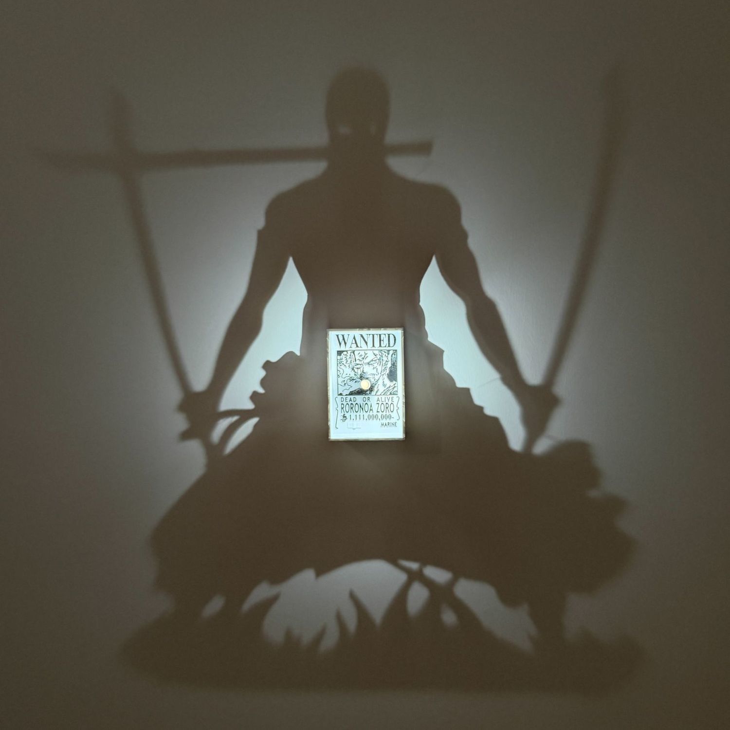 A simple press of the front tactile button activates the internal light. The poster transforms, revealing the epic silhouette of the Three-Sword Style user in action.